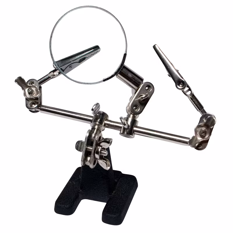 Den hjälpande handen kan hålla små komponenter, kretskort, eller något  som kräver lödning eller fin montering. Levereras med förstoringsglas.  Klämmorna kan anpassas till alla vinklar.