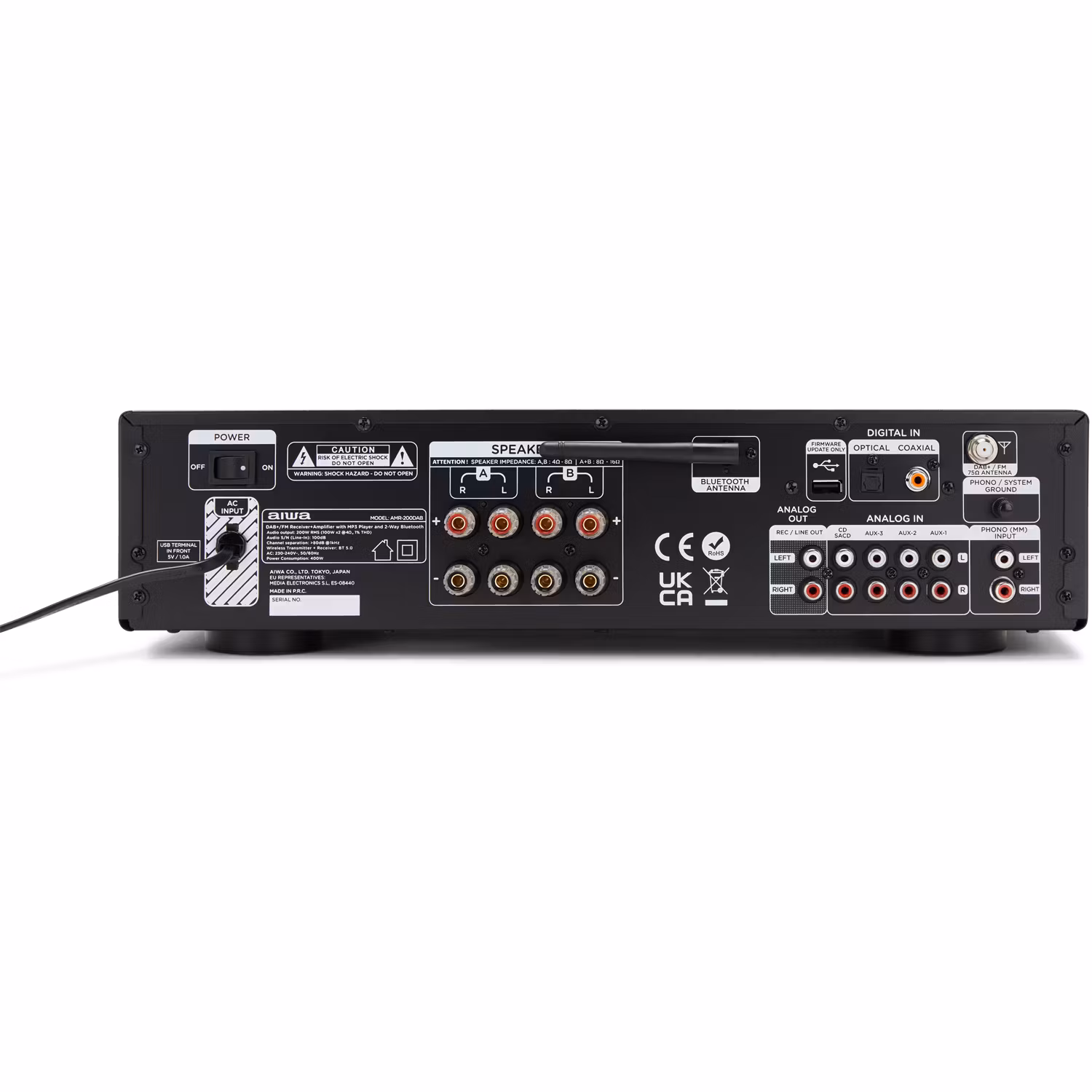 Stereoförstärkare med hög effektAiwa AMR-200DAB/BK levererar 200W kraftfullt, klart ljud (2x 100W RMS @4 Ohm, 0,1% THD). Viktiga funktioner inkluder