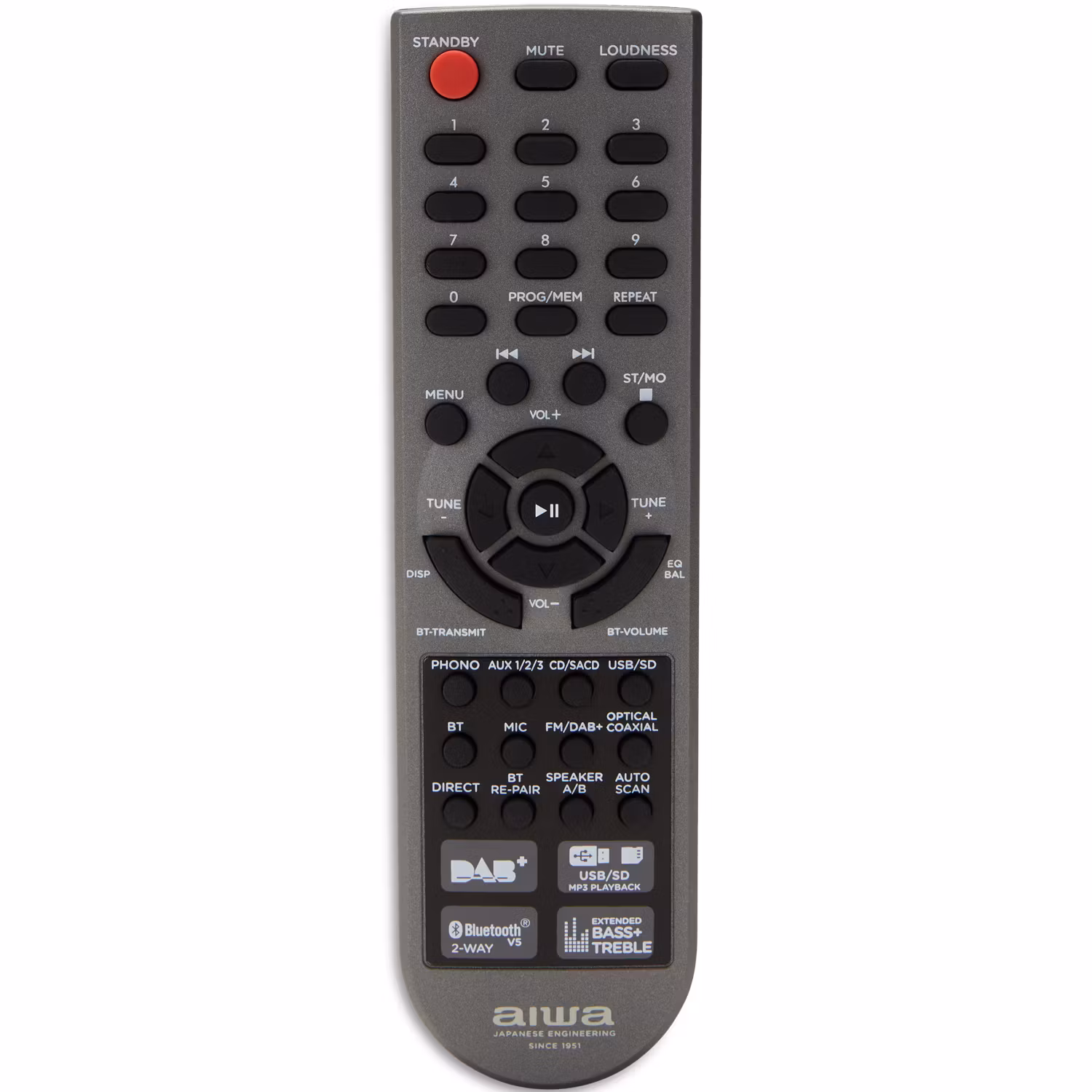 Aiwa AMR-200DAB/BK levererar 200W kraftfullt, klart ljud (2x 100W RMS @4 Ohm, 0,1% THD). Viktiga funktioner inkluderar en phono-ingång med RIAA EQ, Bluetooth v5.0, DAB+ och FM-RDS-radio och anpassningsbara ljudinställningar.