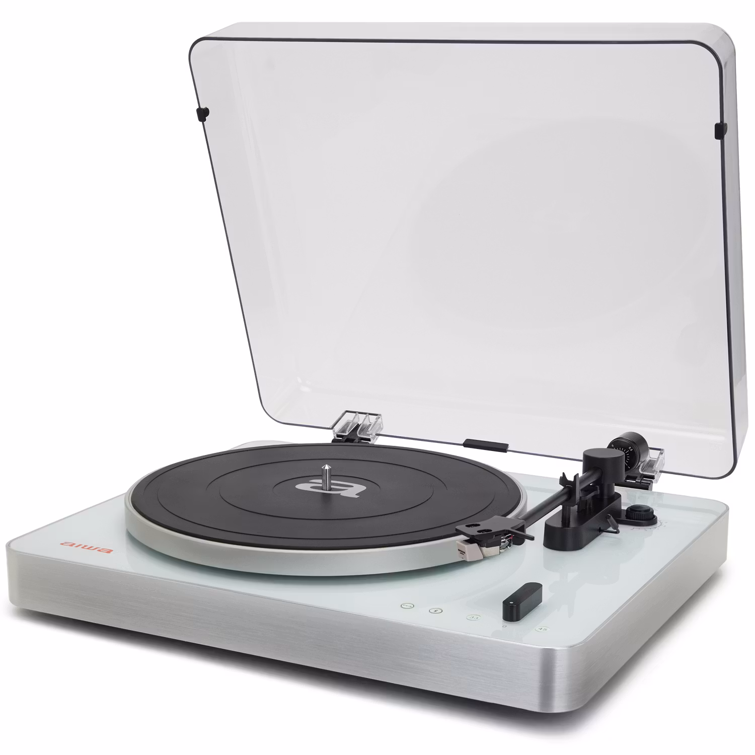 AIWA APX-790BT erbjuder högkvalitativ vinyluppspelning med en  precisionsskiva med 2 hastigheter (33 1/3 och 45 rpm) och en tallrik i  metallegering. Den har en Bluetooth-sändare för trådlös ljudströmning  och en USB-port för professionell inspelning till PC eller Mac.