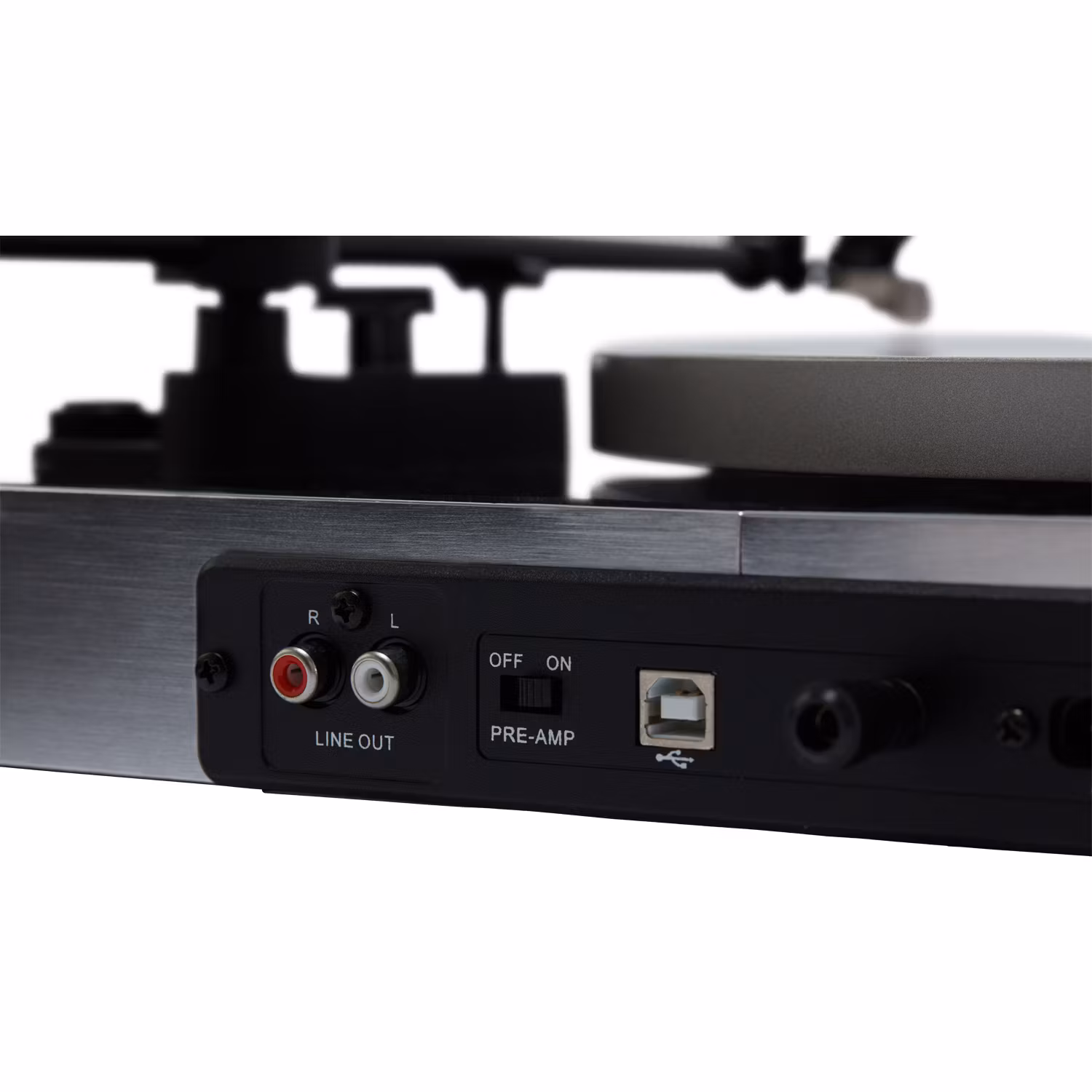 - Inbyggd ljudförförstärkare (med RIAA EQ) för direkt LINE-IN-anslutning till valfri standardförstärkare
