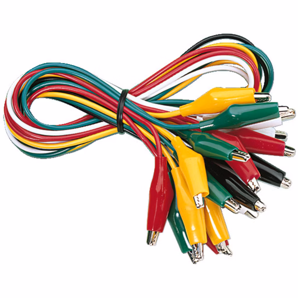 Connection leads, pack  of 10 with two leads each in the colours red, black, green, yellow,  white, with insulated alligator clips. Reinforced version